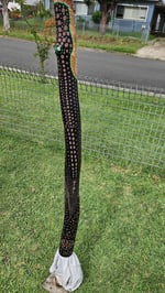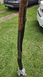 This didgeridoo, handcrafted from Mellaa tree, showcases natural termite hollowing and requires patience. It features a 100 percent natural linseed oil finish on the exterior and a 50/50 PVC glue seal on the interior. Comes with a new beeswax mouth pice. Acrylic paint adorns the didgeridoo, sealed with two coats of White Knight crystal clear. (keyD/E) 1.140m Price $750 Brand New