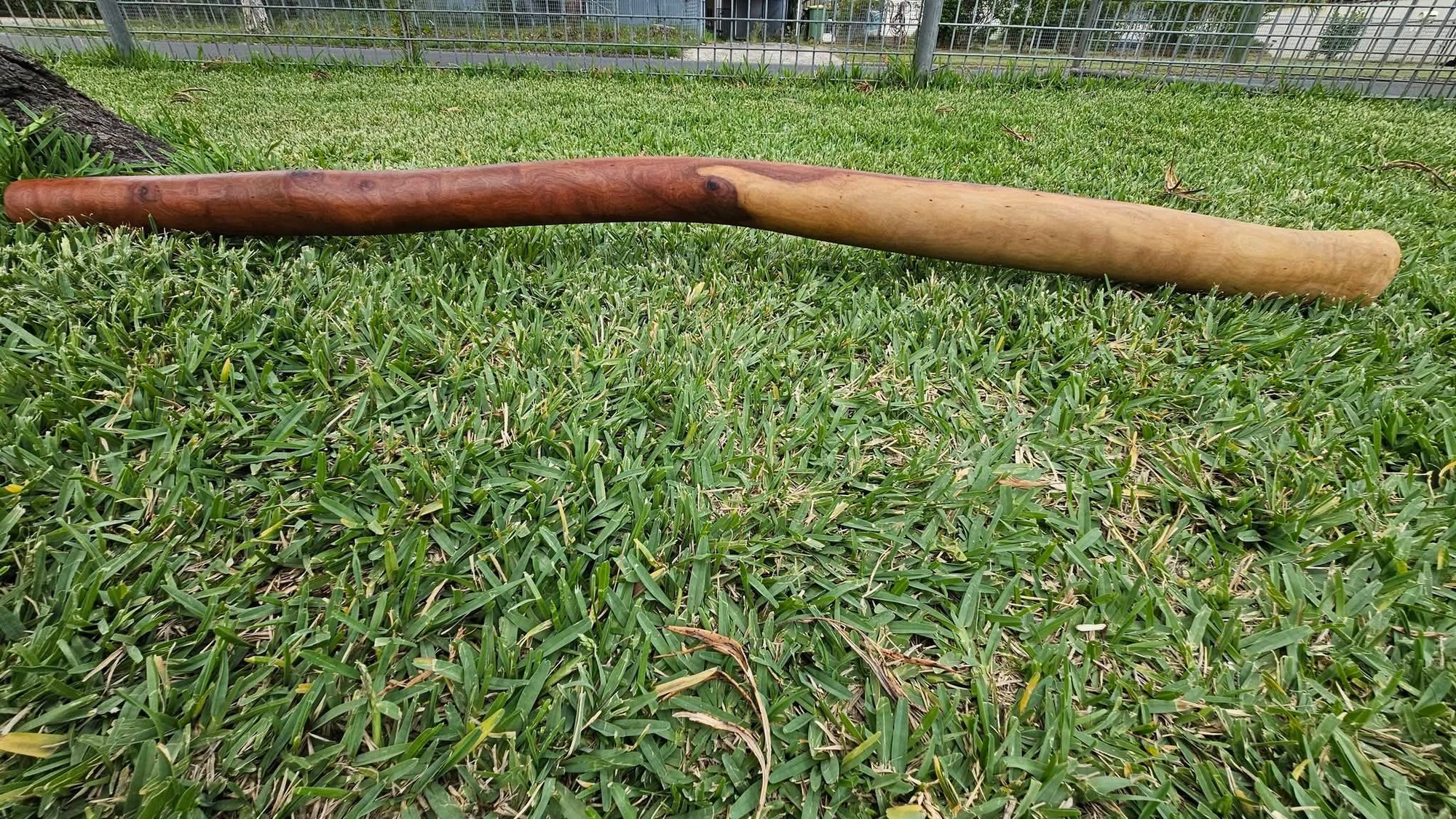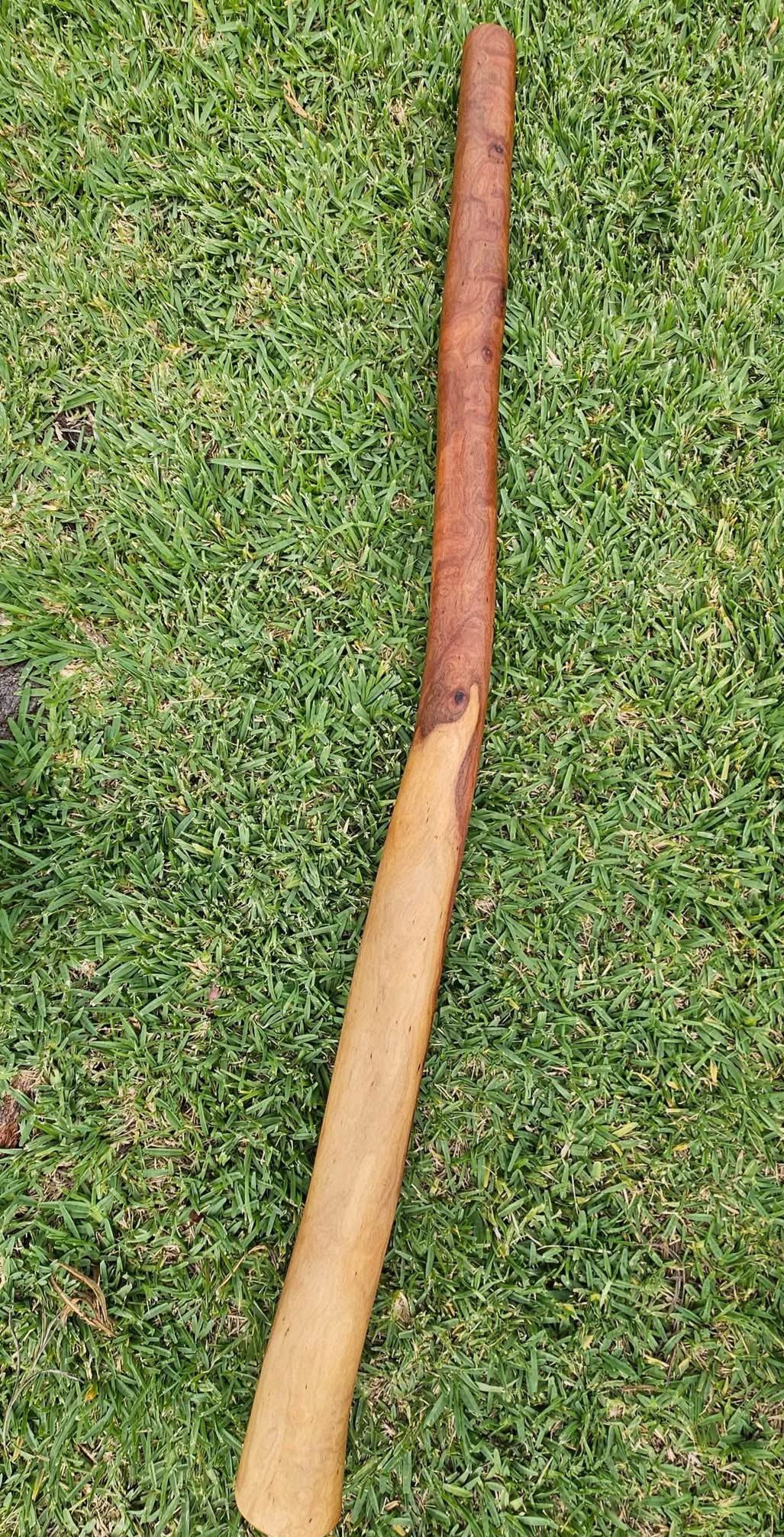 This didgeridoo is handcrafted from Mellaa tree wood, naturally hollowed out by termites, and offers the option of a natural mouthpiece or beeswax mouthpiece. It is a superior example of a solid didgeridoo with exceptional wood grain. The exterior has been treated with 100% natural linseed oil for a natural finish, while the interior is sealed with a 50/50 PVC glue solution, ensuring durability and ease of playability, with excellent back pressure. It comes with a New natural beeswax mouthpiece. Price: $680, brand new. (1.245m) Key D .